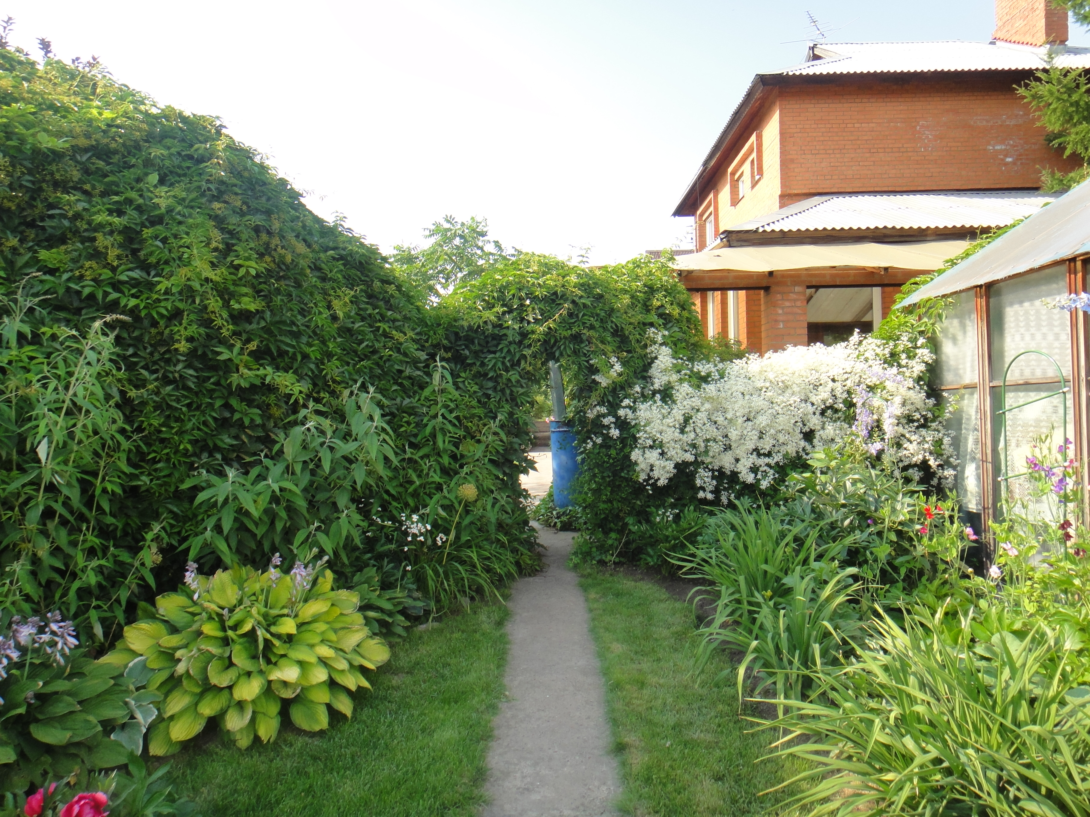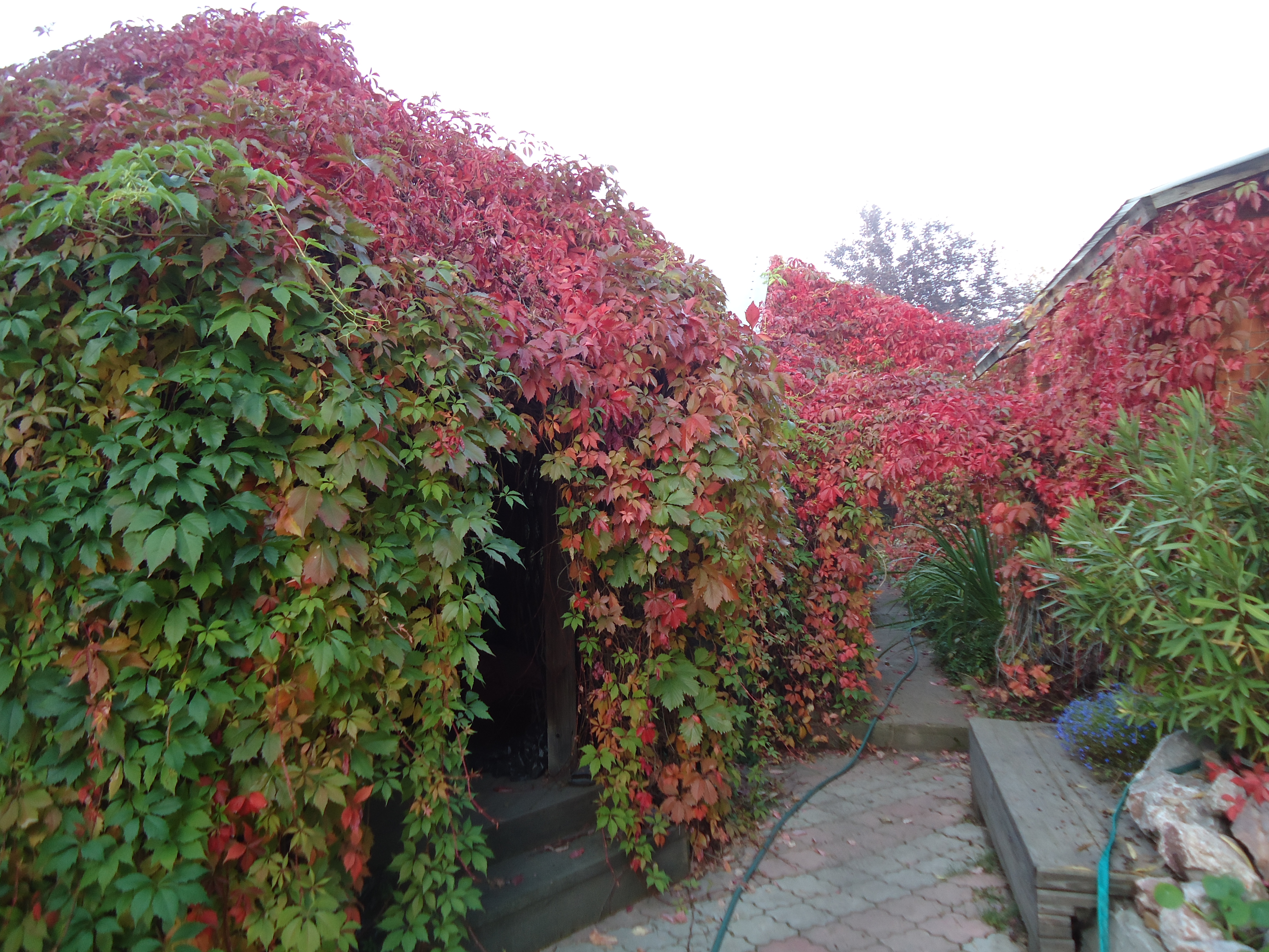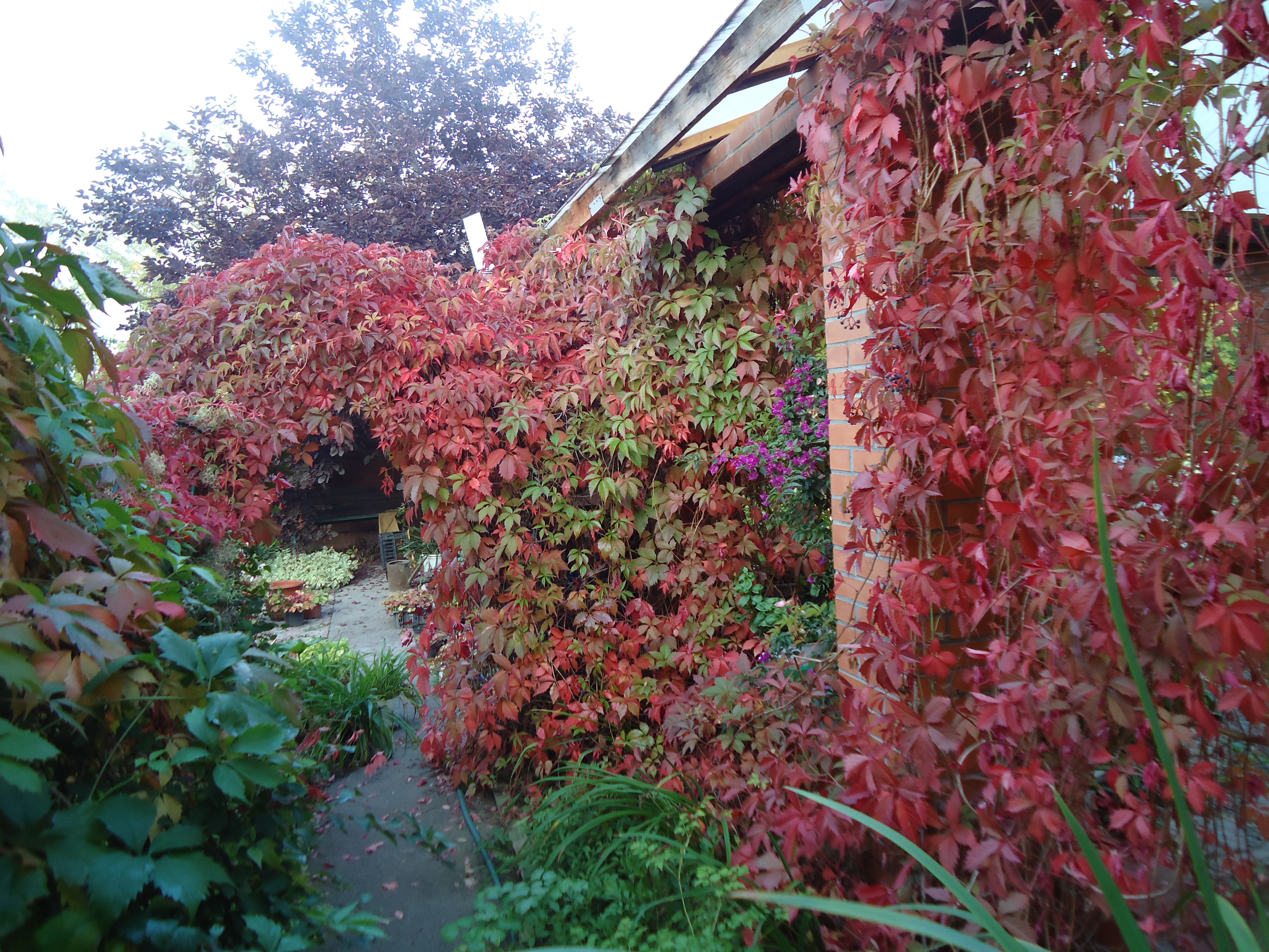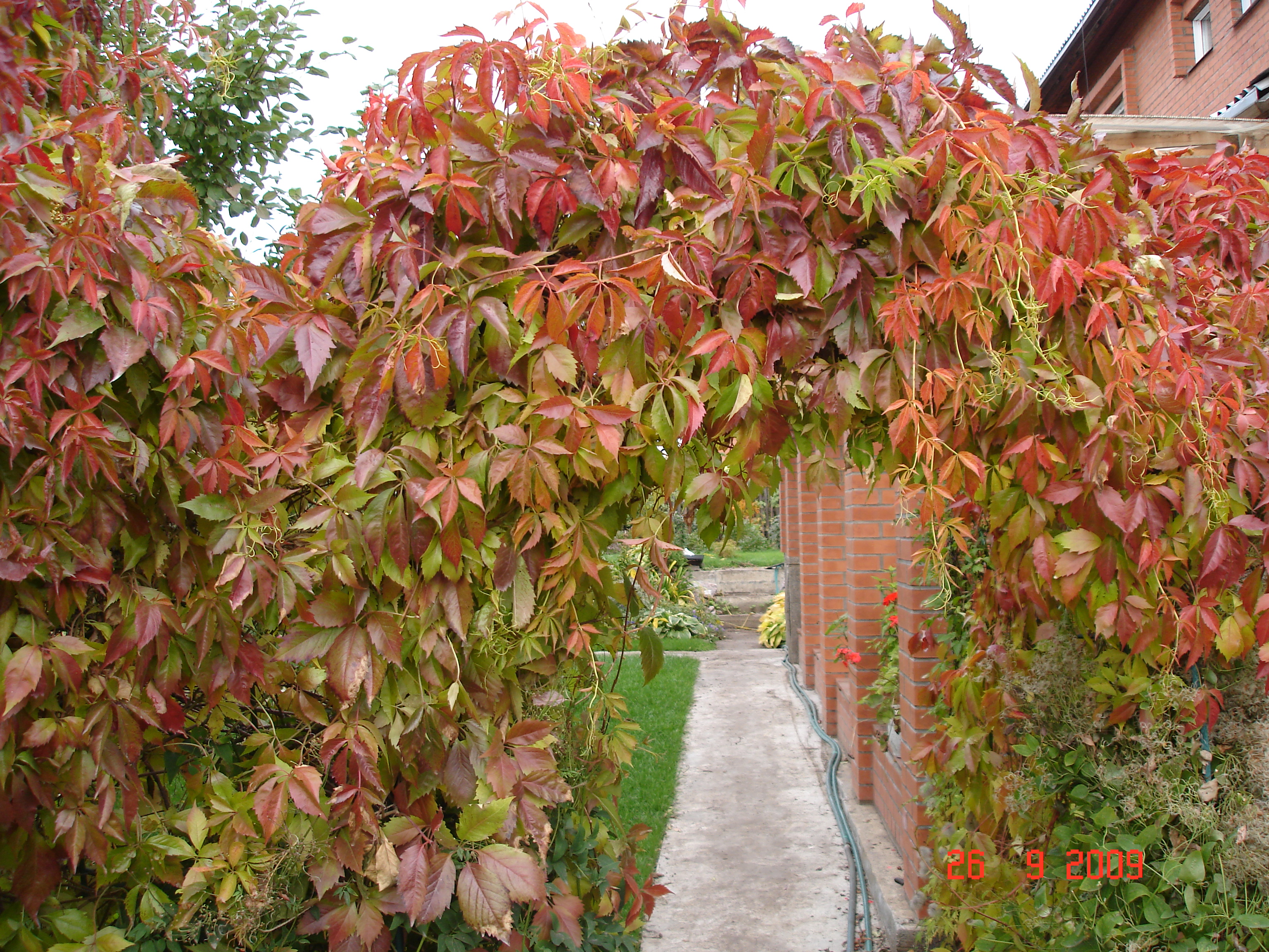 Лето – безусловно, лучшее время в саду, но и в сентябре сад еще красив. В полном цвету красуются роскошные, но чуть грустные георгины, горделивые гладиолусы, да и окружение не подкачало. В теплые дни с тихим шуршанием раскрывают оставшиеся бутоны лилейники и поздноцветущие восточные лилии. Хороши и флоксы метельчатые, множество расцветших боковых побегов превращают соцветия в большие разноцветные снопы, а еще цветут гелениумы, эхинацеи, астры. В общем, в саду есть на что посмотреть, хотя все цветочные культуры уже выглядят заметно «подуставшими», границы цветников размылись и сгладились, что-то переросло, что-то сломало ветром… Приближается холодная осень. Только немногие обитатели сада вопреки всему с каждым днем становится все эффектнее. Безусловно, к осени похорошел газон. Заросли проплешинки, обилие дождей улучшило качество травы, зеленый бархатный ковер будет радовать глаз всю осень и его жизнеутверждающую красоту сможет «победить» только толстый слой снега. Постепенно в убранстве сада выходят на первый план хвойные породы – подросли, расправили лапки-веточки, приготовились быть главными в саду всю зиму. Увы, ненадолго вспыхнут яркими красками листопадные деревья и кустарники и среди них – мощная, бросающаяся в глаза свои осенним нарядом, лиана – виноград девичий пятилисточковый. Даже среди ярких берез и рябин огненная накидка винограда в саду выделяется своим цветом. Но столь броский цвет листьев, от красного до багрового, сохраняется очень недолго, да и не каждую осень бывает, чаще всего сильный, порывистый ветер сносит напрочь еще зеленые листья. Но виноград девичий хорош не только погожей разноцветной осенью, это растение эффектно всегда и украшает сад круглый год, и зимой тоже – графикой своих густо переплетенных побегов. Более мощное, более беспроблемное и оптимистичное растение трудно отыскать в наших сибирских садах. Очень зимостойкое растение, его плети даже на двухметровом кирпичном заборе не подмерзают при самых низких температурах, но главное его достоинство – это красивая, темно-зеленая листва, никогда не поражающаяся вредителями и болезнями. Веселую, беззаботную, южную ноту ощущаешь невольно, глядя на трехметровую плотную завесу, сотканную из множества побегов, всегда стремящихся вперед, вверх, в стороны. Возможности винограда в озеленении сада не используются и наполовину и это в нашем-то климате, где так мало растений, не требующих тщательного и регулярного ухода, и уж тем более из числа лиан.