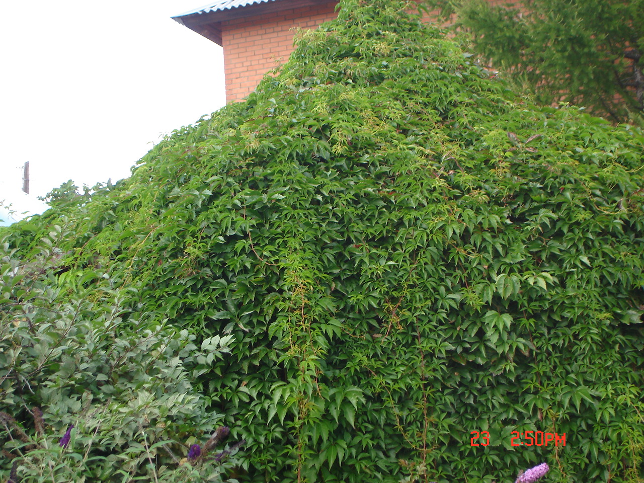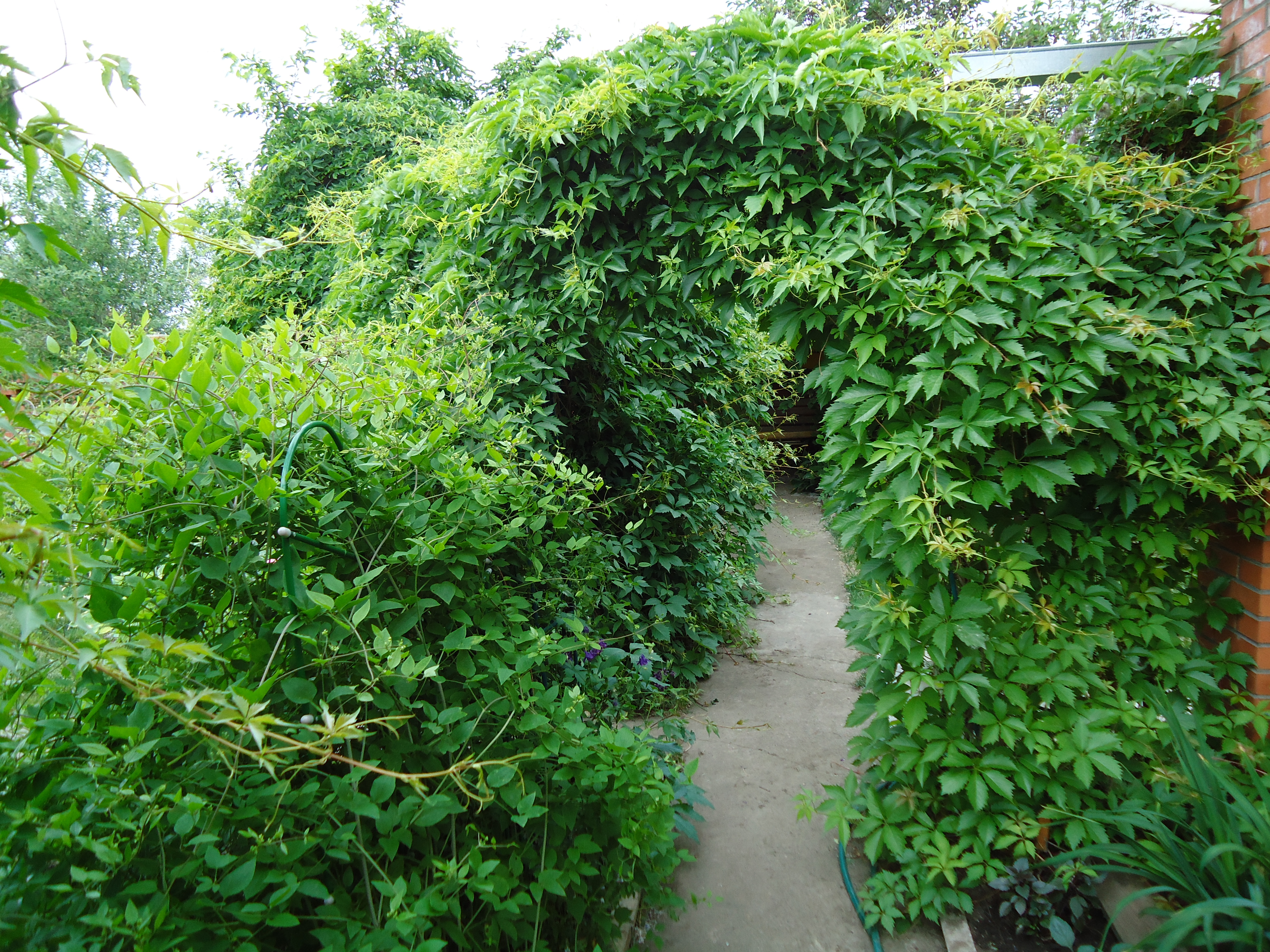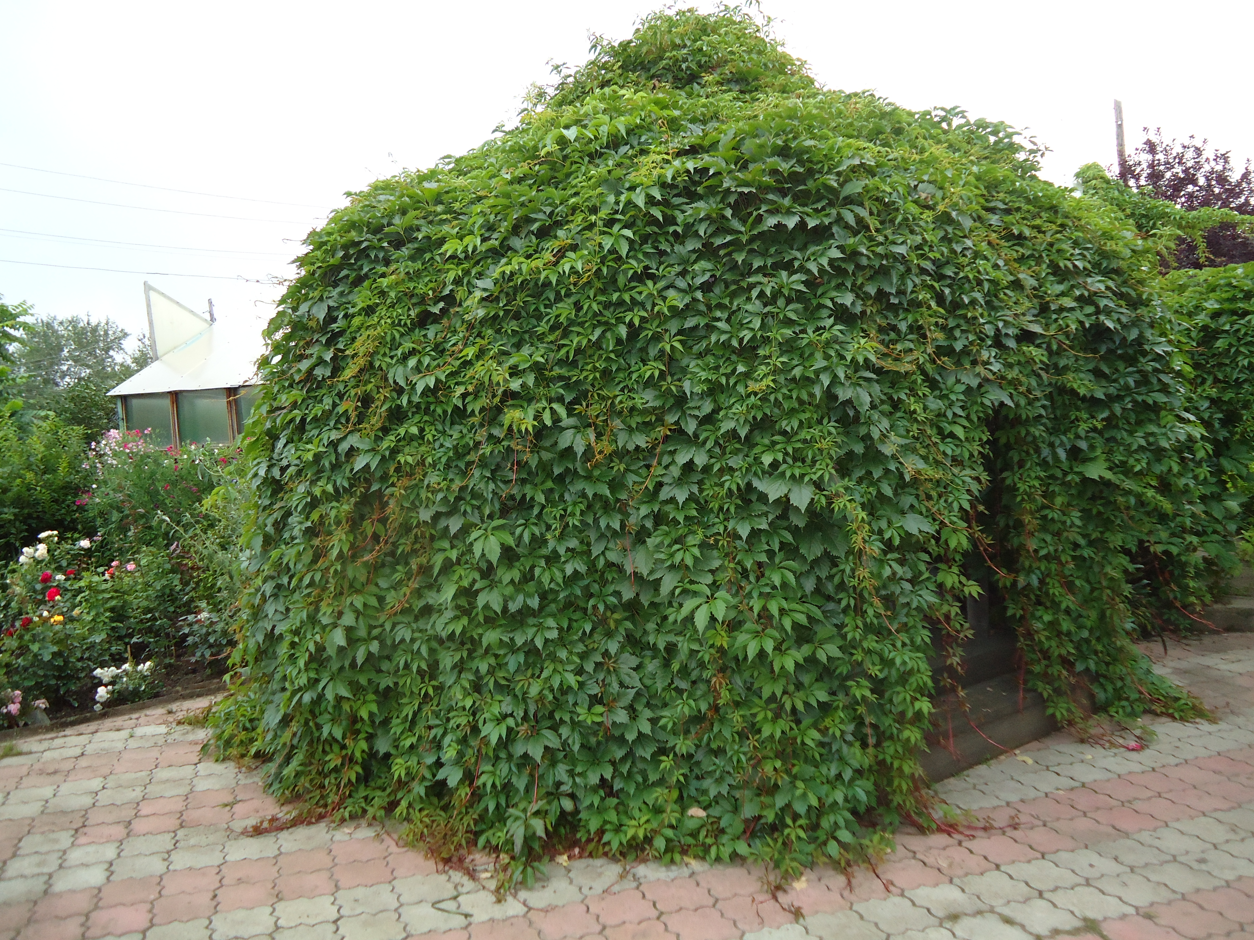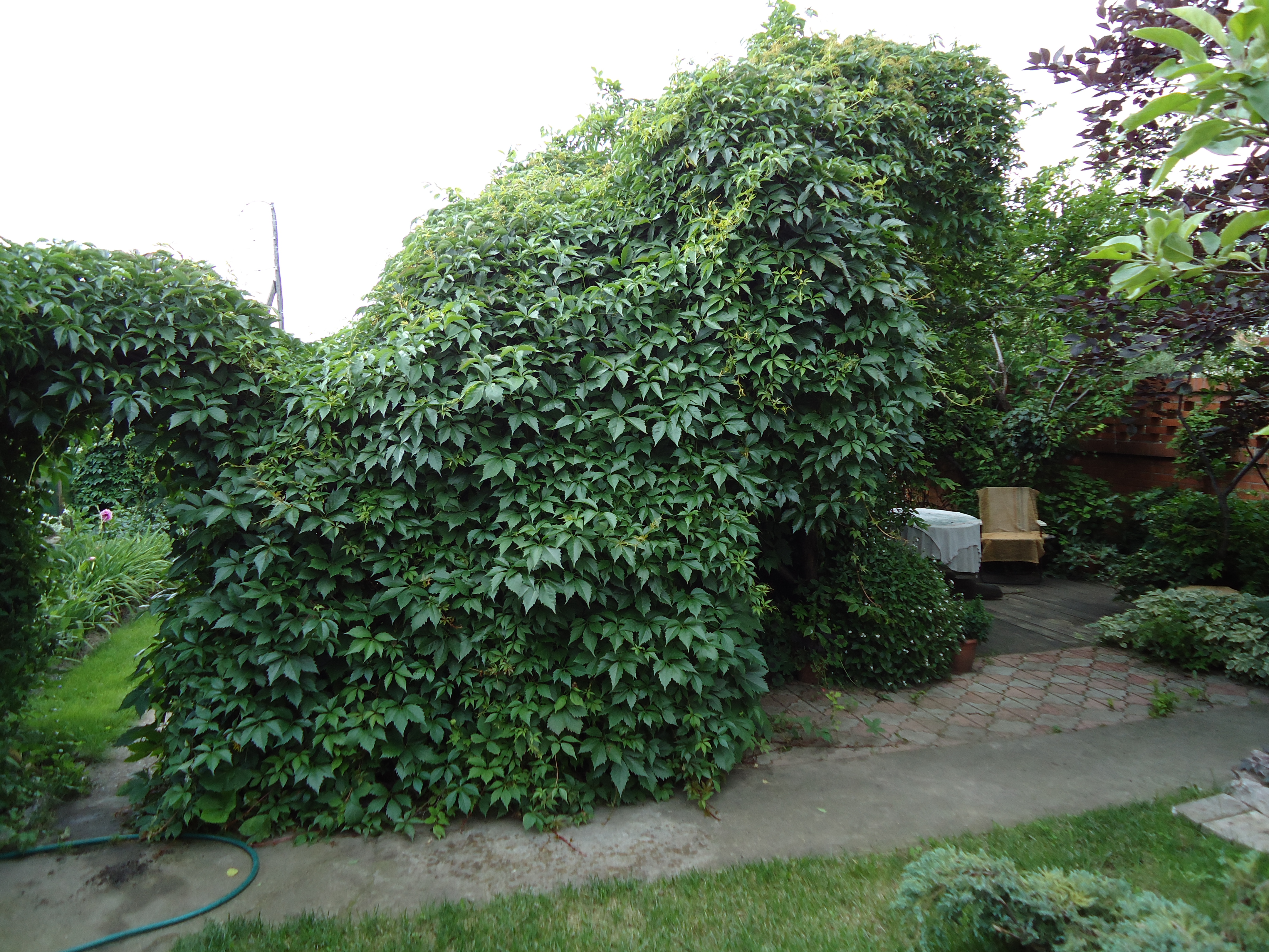 Девичий виноград пятилисточковый, или партеноциссус, относится к семейству виноградовых, но совсем не тот виноград, о котором мы все наслышаны, хотя тоже усиконосная лиана, прикрепляющаяся к опоре с помощью чувствительных усиков. Это декоративно-лиственное листопадное растение с очень интенсивным годовым приростом, с крупными темно-зелеными сложными листьями, похожими на листья каштана. Главное назначение винограда девичьего, как любой другой лианы, создание в саду вертикалей, разделительных ширм, навесов над площадками отдыха, а также декорирование беседок, стен, неприглядных строений. Трех сезонов достаточно, чтобы тонкие прутики превратились в почти непроницаемую для света завесу, полностью укрыв пышной зеленью любую конструкцию. Так получилось с беседкой в моем саду. Виноград девичий настолько плотно укутал решетки беседки, что даже в солнечный день там практически темно. Но выглядит беседка довольно эффектно – свободно расползающиеся по решетке побеги, переплетаясь, образуют своеобразный самостоятельный каркас с яркими блестящими листьями и кистевидными щитками-соцветиями с желто-зелеными бусинками цветов летом, а осенью с гроздями синих, но не съедобных ягод. Эта неприхотливая лиана быстро «создаст» и очень заметную в саду арку, и плотную разделительную ширму, и задний фон для цветника, но направлять плети на тонкие проволочные дуги не следует. Такая опора непременно и быстро потеряет форму или даже сломается под тяжестью массы побегов и листьев.
