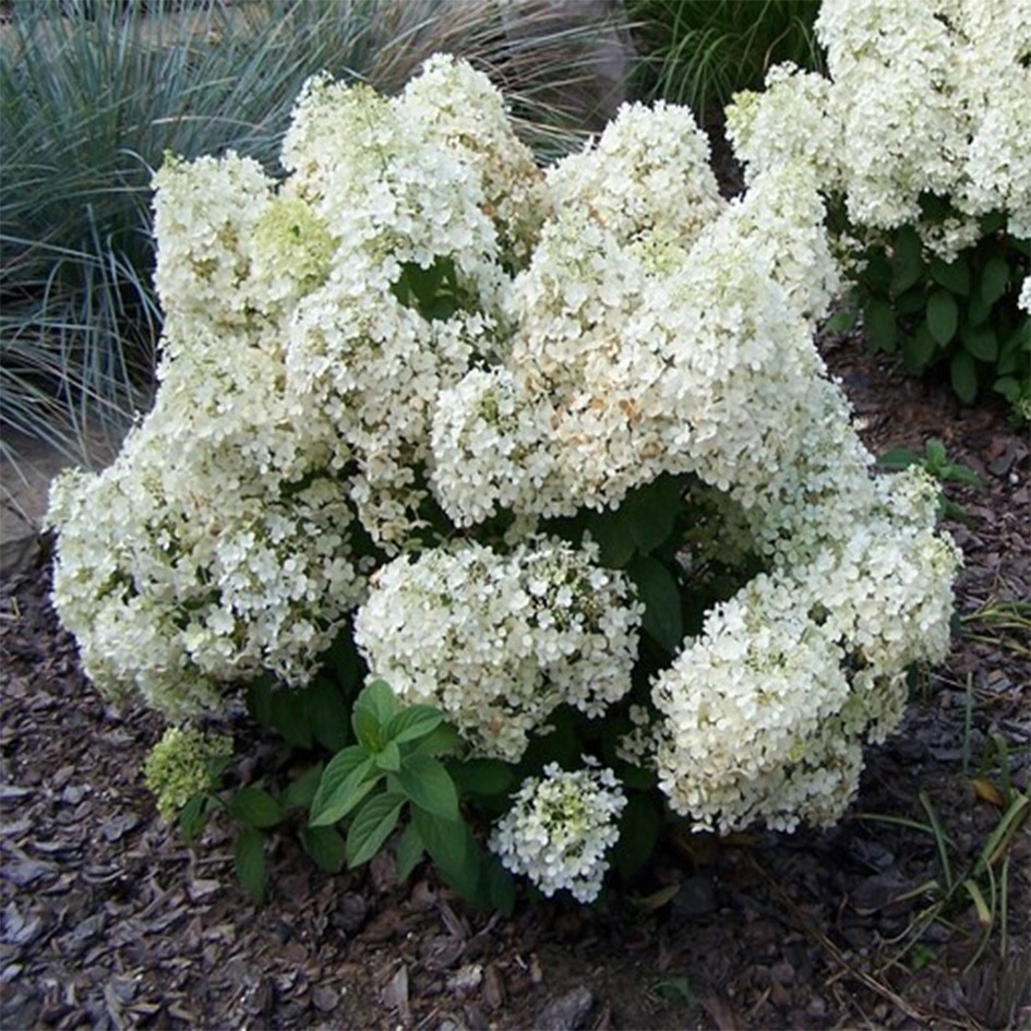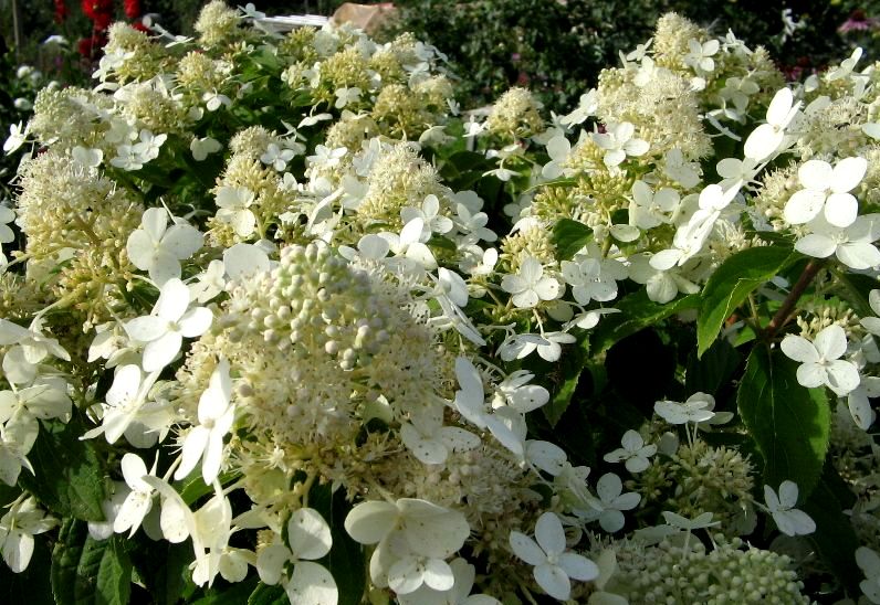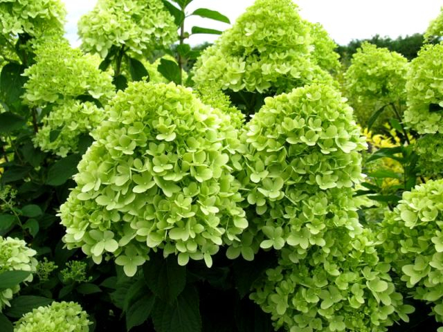 5. ЛАЙМ ЛАЙТ (LIME LIGHT) – отличительной чертой этого сорта являются очень крупные, тяжелые, густо набитые стерильными цветками огромные соцветия зеленоватого цвета в начале цветения. Затем, к осени, цвет становится розовым. Стебли растения крепкие, сильные и легко удерживают крупные соцветия до самой осени. Цветение начинается с конца июня, куст высотой до 2м и такой же в ширину.