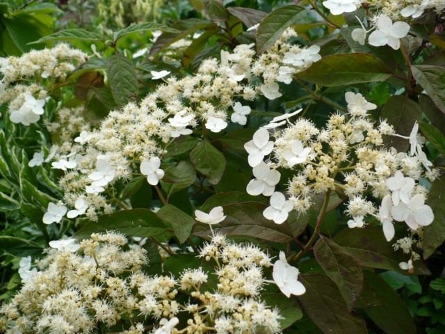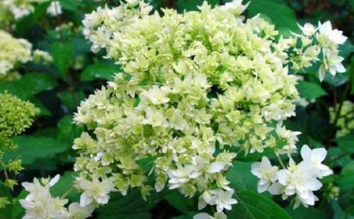 2. Гортензия Бретшнейдера (Bretschneideri) – высота и диаметр растения до 3-х м, округлая, с раскидистыми побегами, достаточно засухоустойчивая, в поливе нуждается только в засуху. Родина растения - Северный Китай. Культивируется с 1882 г. Листва меняет свою окраску от насыщенно – темно – зеленых оттенков весной и летом до желто – бурого цвета осенью. Цветки собраны в щитковидные соцветия и держатся очень долго. В начале цветения цветочки имеют зеленоватый оттенок, переходящий в чисто белый. Затем появляется розовая окраска, а к концу лета лепестки становятся малиновыми. При поливе кислым раствором снежно – белые лепестки могут стать голубыми. Зимостойкость у данного вида высокая, но в суровые зимы могут подмерзать концы побегов. Соцветия щитковидные, в основном с фертильными цветками и только по краям цветки стерильные, крупные, до 3-х см в диаметре. Взрослое растение имеет красивую раскидистую форму, не агрессивна. Иногда ее называют почвопокровной, но это ошибочное мнение. Цвести начинает на 6-ой год.