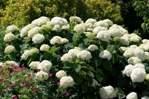1. Гортензия древовидная (Arborescens) – имеет пышный раскидистый куст с многочисленными гибкими побегами. Декоративна с весны и до поздней осени. Цветение начинается раньше других видов, с июня по октябрь. Хорошо смотрится в одиночных посадках, когда куст можно рассмотреть со всех сторон. Место для посадки выбирают так, чтобы растение было укрыто от холодных ветров и сильного палящего солнца. А если гортензия посажена на открытом месте, не забывайте хорошо поливать его, ведь это «сосуд с водой». Растет гортензия древовидная быстро. Не забывайте подкармливать растение слабым раствором марганцево-кислого калия для укрепления побегов. Шапки цветов могут достигать в диаметре 25см и под их тяжестью, а также во время ветра и дождя веки растения могут сломаться. Поэтому куст необходимо еще и подвязывать. На зиму куст связывают, чтобы его не сломало снегом, подсыпают под него ведро перепревшего перегноя и зимой обязательно набрасывают снег. Цвести гортензия древовидная начинает на 3-4 год. Выведены гортензии в Северной Америке, зона зимостойкости – 3.