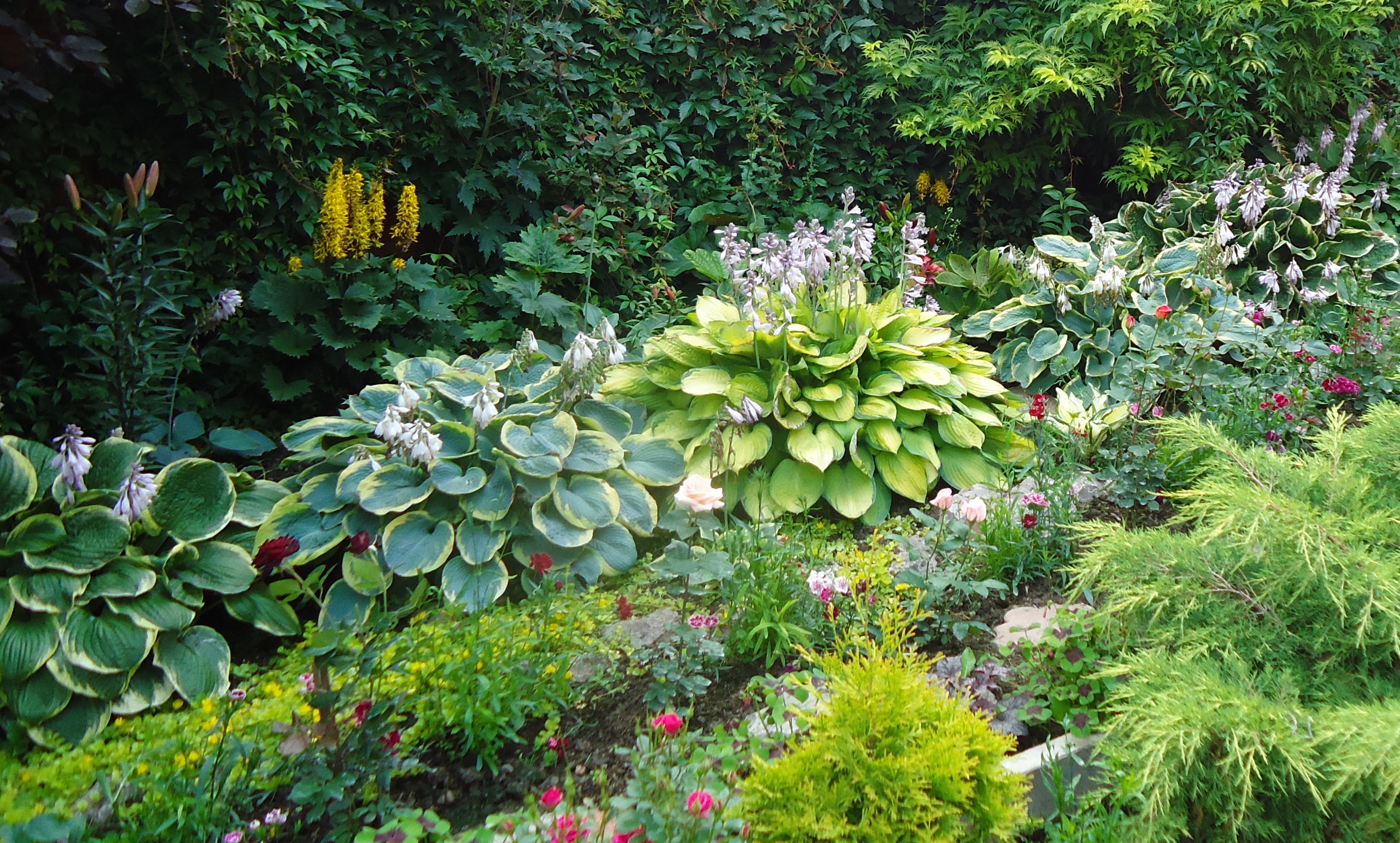 Несмотря на рельефные формы хост группы siboldiana, посадки не выглядят громоздкими, перенасыщенными, хотя определять оптимальное количество растений для разных целей совершенно необходимо. Кроме того, важен и сортовой состав, ведь для акцентных посадок, где ценится эффектность куста, и для окаймления других композиций, где нужно подчеркнуть чёткие границы пространства, мы выбираем совершенно разные сорта. Высокие солитерные посадки создадут такие сорта, как Prince Walles, Blue Angel, Blue Mammotch, Nortern Exposure, для акцентов среднего плана вполне подойдут Dream Weaver.Big Daddy, а лучший бордюр получится из хост с аккуратными, не разваливающимися кустиками и некрупными листочками, например, Halcion, Paradise Yoyce, Yune. Сорта, о которых шла речь, являются «родственниками» хосты siboldiana и требуют они примерно одинаковых условий при выращивании, главные из которых – большая или меньшая затенённость участка, очень плодородная почва и своевременный полив. Но есть ещё очень большое количество сортов, которые хорошо переносят солнечные лучи, а светлых, открытых солнцу участков в саду даже больше, чем тенистых. В следующей статье поговорим о сортах хост с жёлтыми и почти белыми, с гладкими и тонкими листьями, которые не выглядят так брутально, как хосты групп siboldiana или montana, но не менее эффектны, и мы обязательно подберём им уютное место в саду.