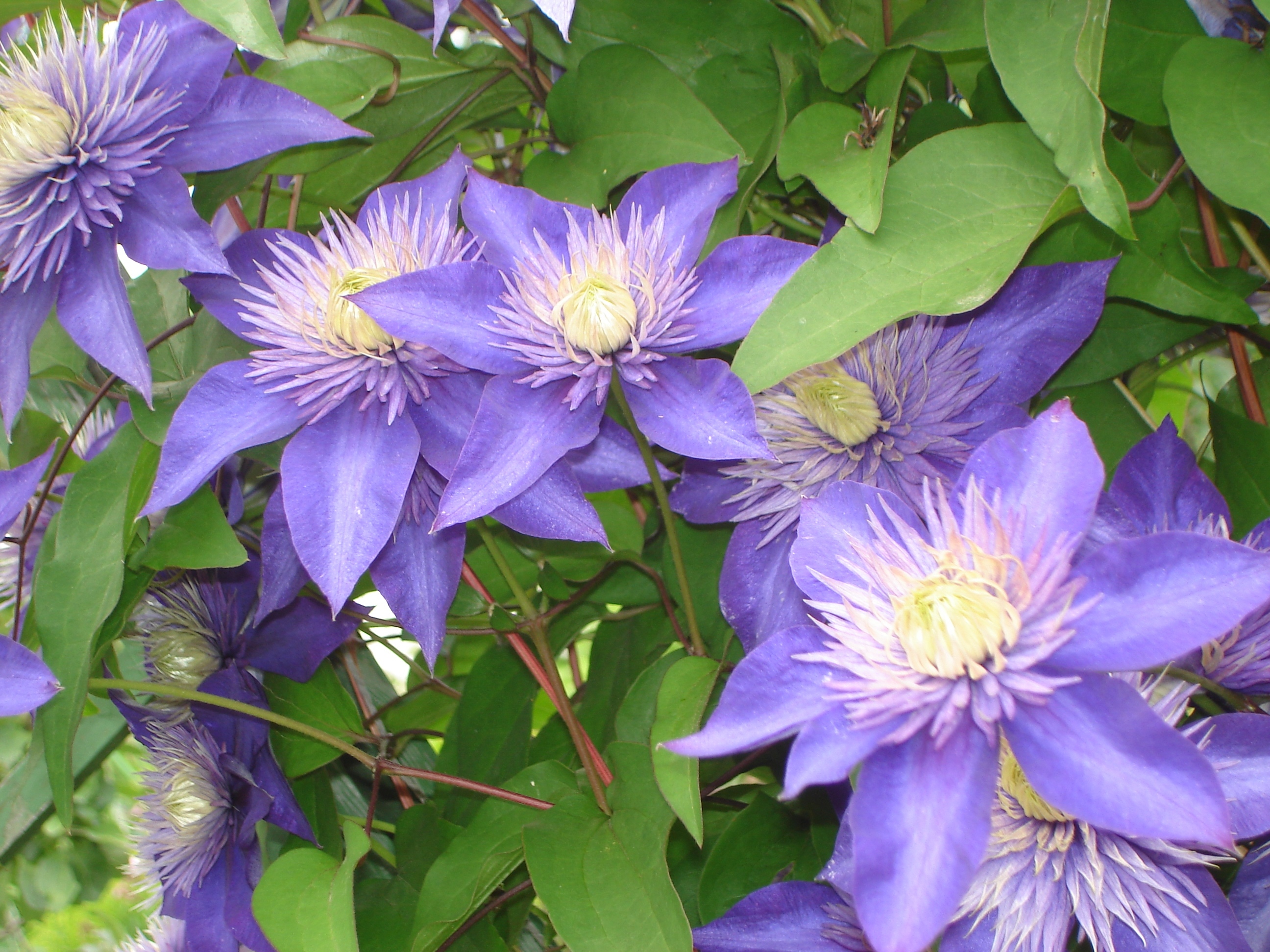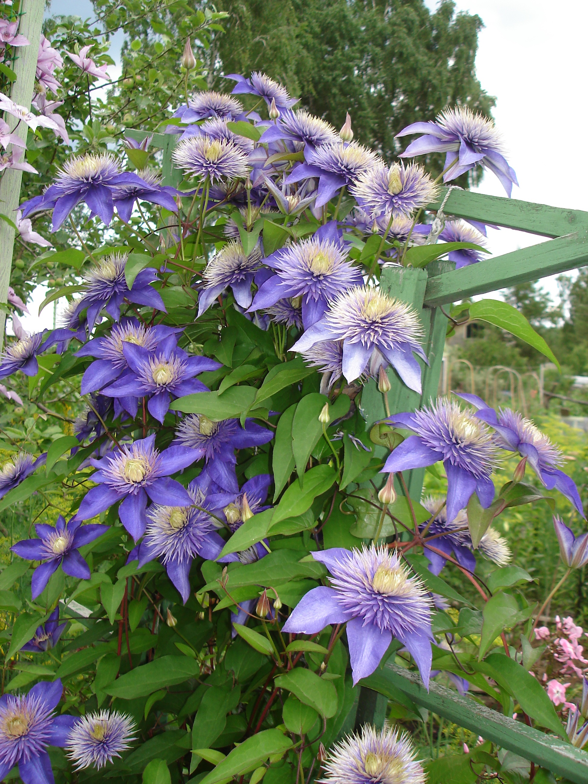 К 1-й группе относятся клематисы Джакмана, Витицела и Интегрифолия, цветут они с июля, цветки простые до 20 см в диаметре, разнообразной окраски. Клематис этих групп относятся к 3-му типу обрезки, то есть осенью побеги обрезают на 2-5 почек и хорошо укрывают.