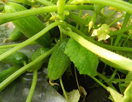 Землю из лунок переношу на грядку для огурцов и высаживаю огурцы в один ряд на расстоянии примерно 13-15 см друг от друга, а по краю гряды с двух сторон сею редис, ориентировочно 10-15 мая. Посаженные огурцы закрываю пластмассовой бутылкой с открытым горлом. Поливаю два раза в неделю одновременно редис и огурцы. При появлении трех листов бутылки с огурцов снимаю и они растут без укрытия. Снимаю урожай редиса и к этому времени огурцы подрастают и плети самостоятельно располагаются в разные стороны. Огурцы растут самостоятельно без подвязывания, плети при такой посадке хорошо проветриваются.